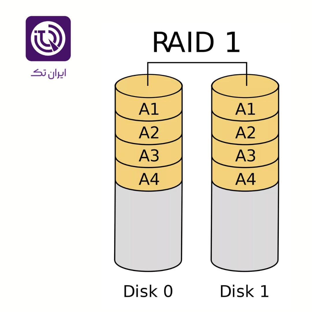 در RAID 1، دادهها بهصورت **Mirroring** بین دو دیسک کپی میشوند. این یعنی هر دیسک دقیقاً همان چیزی را دارد که دیسک دیگر دارد. در صورت خرابی یکی از دیسکها، سیستم بدون هیچ وقفهای از دیسک دوم ادامه کار میدهد. این روش بسیار ساده و قابل اعتماد است و برای کاربران خانگی که دو هارد دیسک دارند، بهترین گزینه برای محافظت از دادههاست. البته معایبی هم دارد: تنها نیمی از ظرفیت کل دیسکها قابل استفاده است و سرعت نوشتن بهبود چندانی نمییابد.